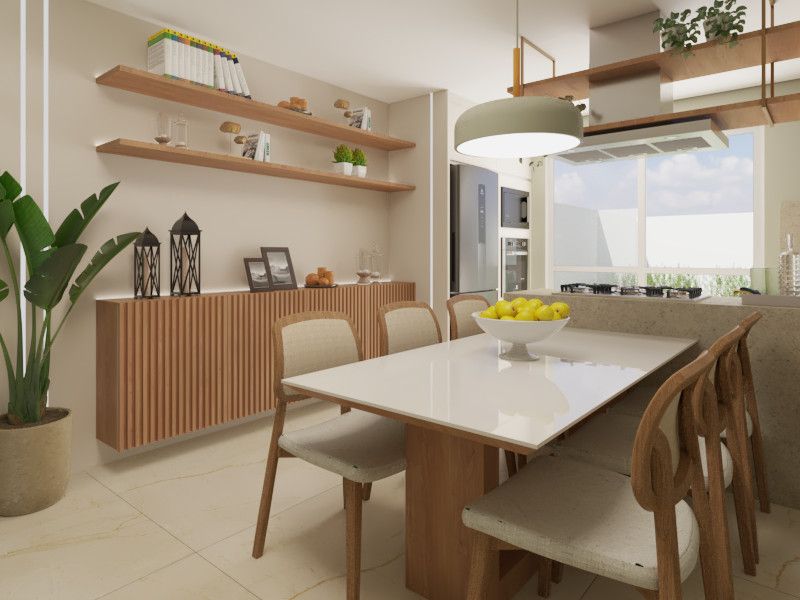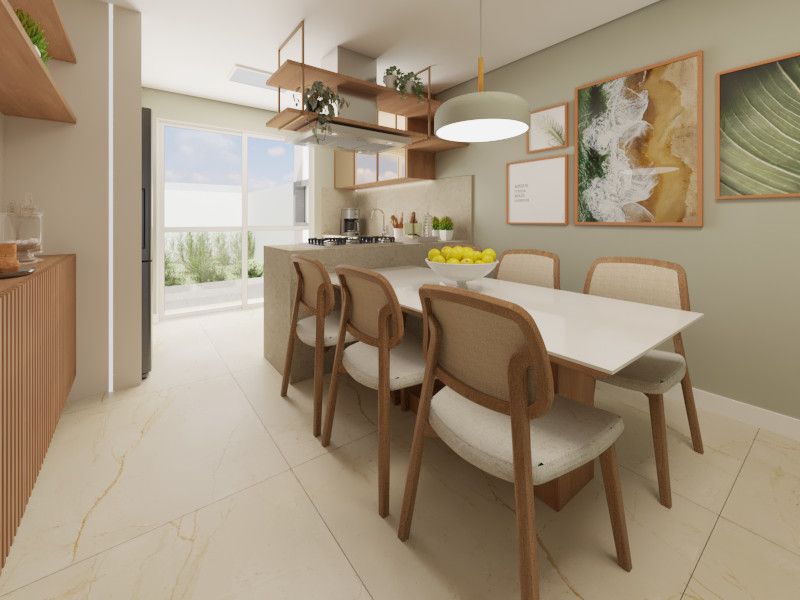 • Sala de estar integrada à cozinha em conceito aberto, criando um espaço moderno, funcional e bem iluminado naturalmente;