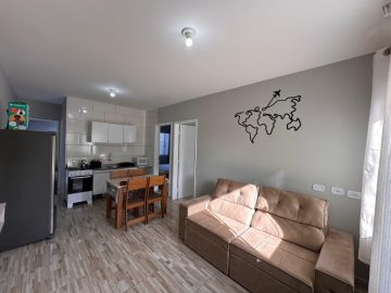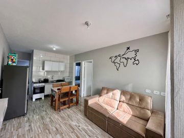 - Sala e cozinha em conceito aberto, integrando praticidade e modernidade