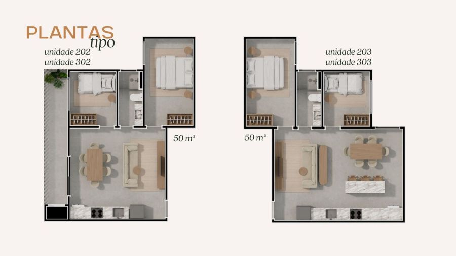 - Unidade 202 – 50 m² | R$ 420.000,00 (varanda com churrasqueira)